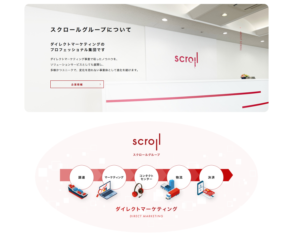 あわせて、グループの核となるダイレクトマーケティングのノウハウを軸としたマーケティングソリューションの全体像や、4つの事業セグメント、グループ各社を紹介するパートを新設しました。情報を体系的に整理することで、必要なコンテンツへよりスムーズにアクセスいただけるページとして生まれ変わりました。