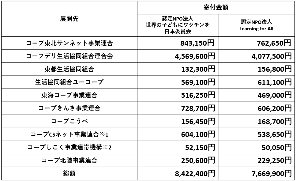 2025年度は、本プロジェクトの寄付金として総計16,092,300円を、展開先の各生協様と連携し、以下の団体へ贈呈しますことをご報告いたします。